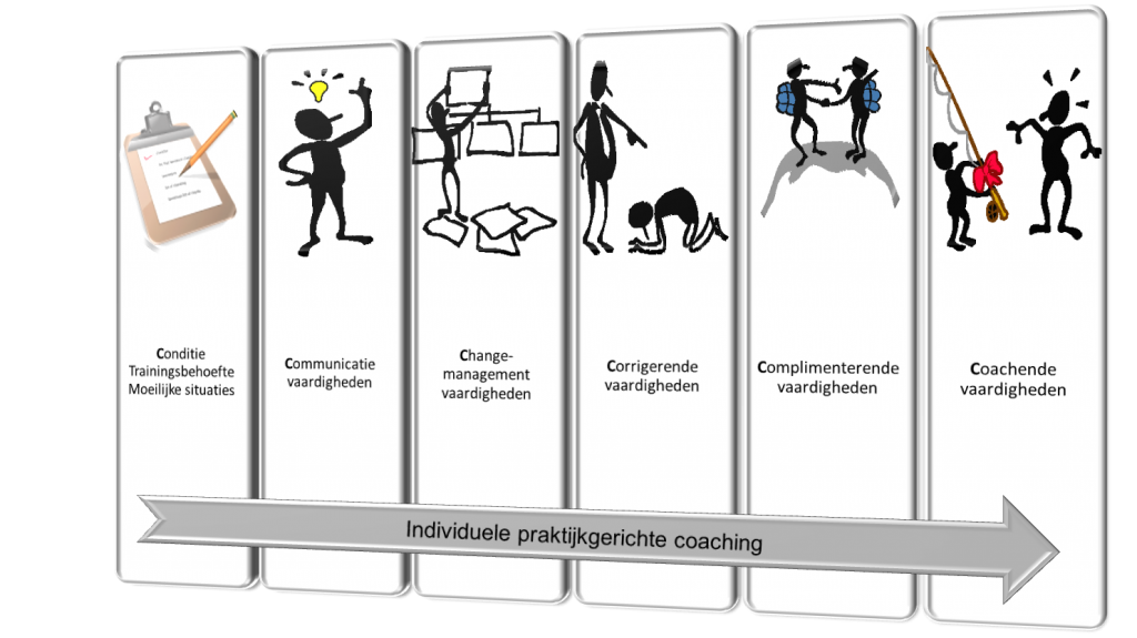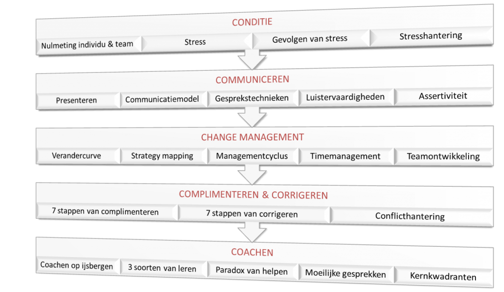 Om een maximale transfer van de trainingssituatie naar de praktijksituatie te realiseren wordt naast het aanreiken van modellen en denkkaders, vooral aan de hand van praktijkcases van de deelnemers geoefend. Hierbij wordt gebruik gemaakt van rollenspellen en videofeedback. De bijeenkomsten vinden met een tussenperiode van 3 à 4 weken plaats, zodat de deelnemer de gelegenheid heeft om de getrainde onderwerpen in de praktijk toe te passen en tijdens de volgende bijeenkomst te evalueren. Bij ontwikkelingstrajecten participeert afhankelijk van de problematiek en behoefte tijdens de training een gedragstherapeut. In onderstaand overzicht zijn de verschillende trainingsmodules opgenomen.